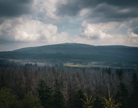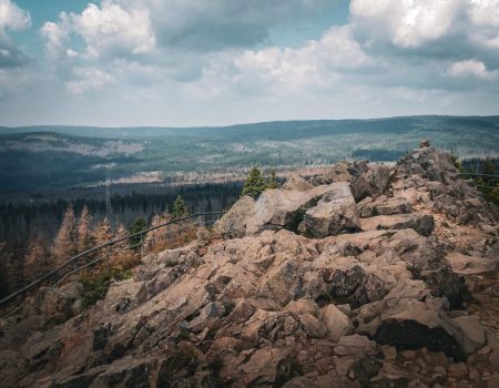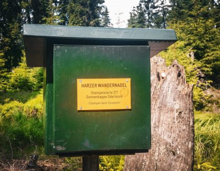 Der Weg führte zunächst über den Millionenweg stetig bergauf durch dichten Harzwald. Nach einiger Zeit erreichten wir schließlich den Gipfel der Achtermannshöhe. Hier befindet sich die Stempelstelle 12 der Harzer Wandernadel. Das Wetter spielte gut mit: leichte Wolken, aber insgesamt klare Sicht. Von oben hatten wir eine schöne Aussicht über die Harzlandschaft – ein perfekter Platz für eine kurze Pause.