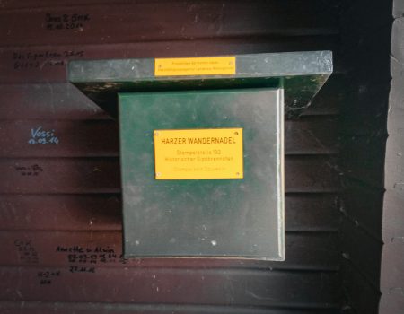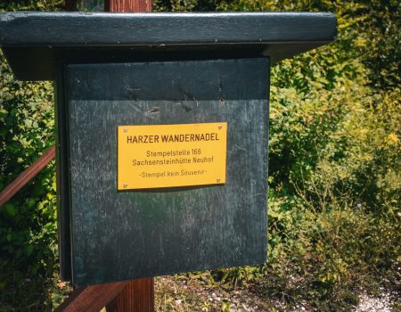 Danach ging es leicht bergauf weiter zur Ritterbornquelle und anschließend am Sachsenstein (Harz) vorbei. Schließlich kamen wir zur Sachsensteinhütte, wo sich die Stempelstelle 166 befindet. Von hier hat man einen schönen Blick auf Neuhof und das Harzvorland.