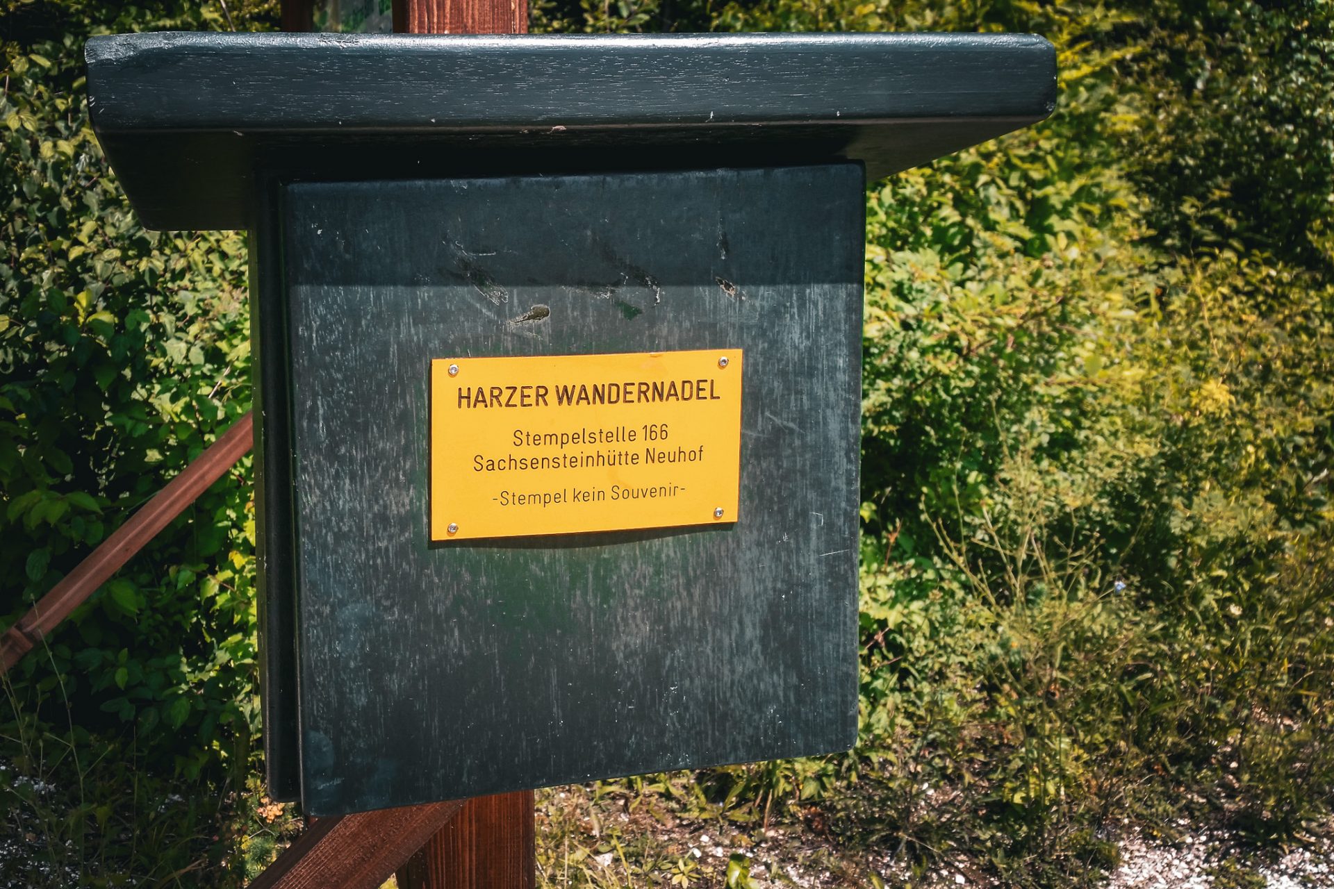 Danach ging es leicht bergauf weiter zur Ritterbornquelle und anschließend am Sachsenstein (Harz) vorbei. Schließlich kamen wir zur Sachsensteinhütte, wo sich die Stempelstelle 166 befindet. Von hier hat man einen schönen Blick auf Neuhof und das Harzvorland.