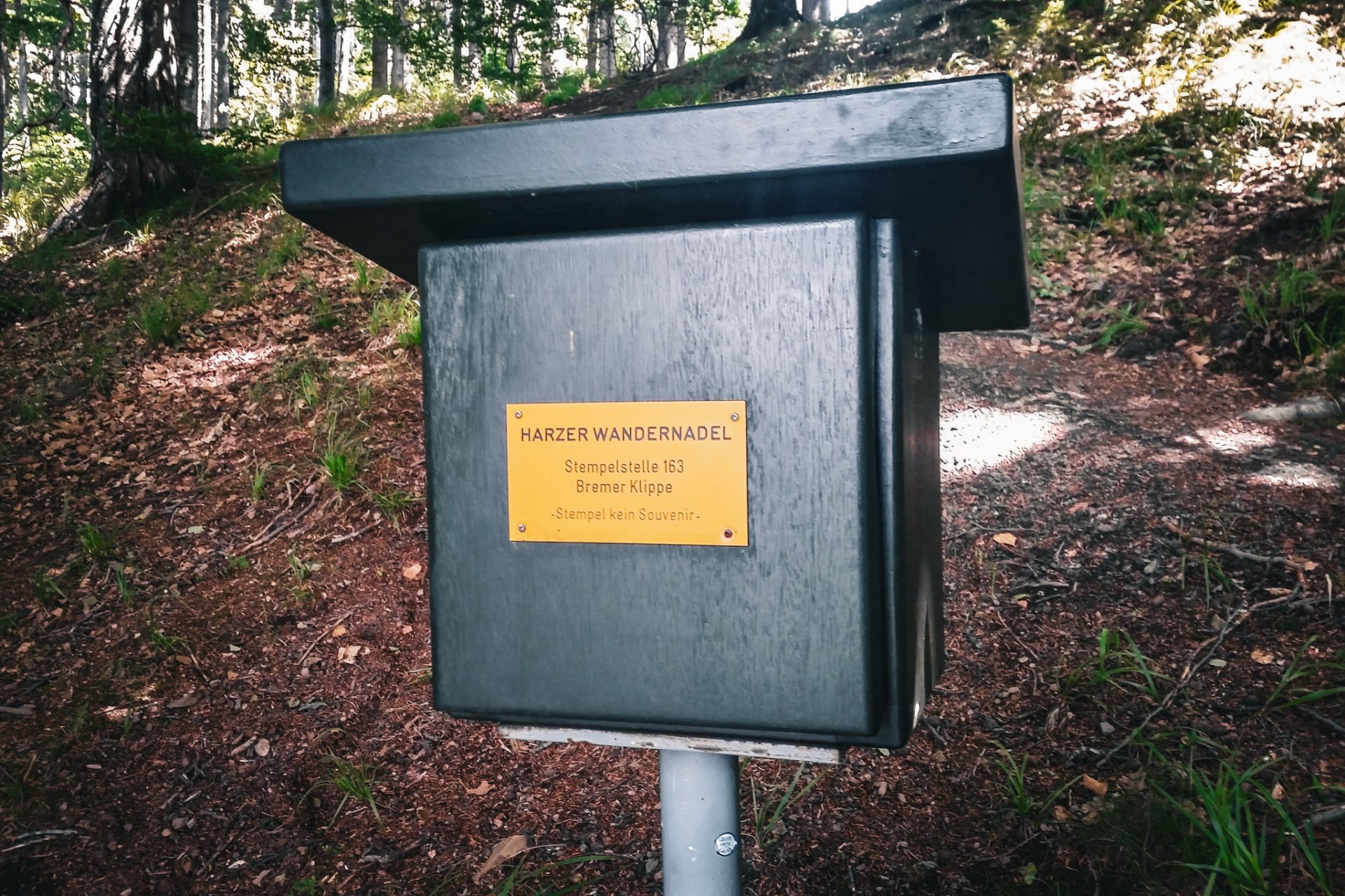 Nach einer kurzen Pause ging es weiter über den historischen Kaiserweg (Harz), der auch Teil des bekannten Harzer Baudensteig ist. An einer Wegkreuzung verließen wir den Hauptweg kurz und stiegen hinauf zur Bremer Klippe. Dort wartete bereits die nächste Stempelstelle auf uns: Stempel 163. Die Klippe bietet eine schöne Aussicht über die Wälder des Südharzes und ist ein lohnender kurzer Abstecher.